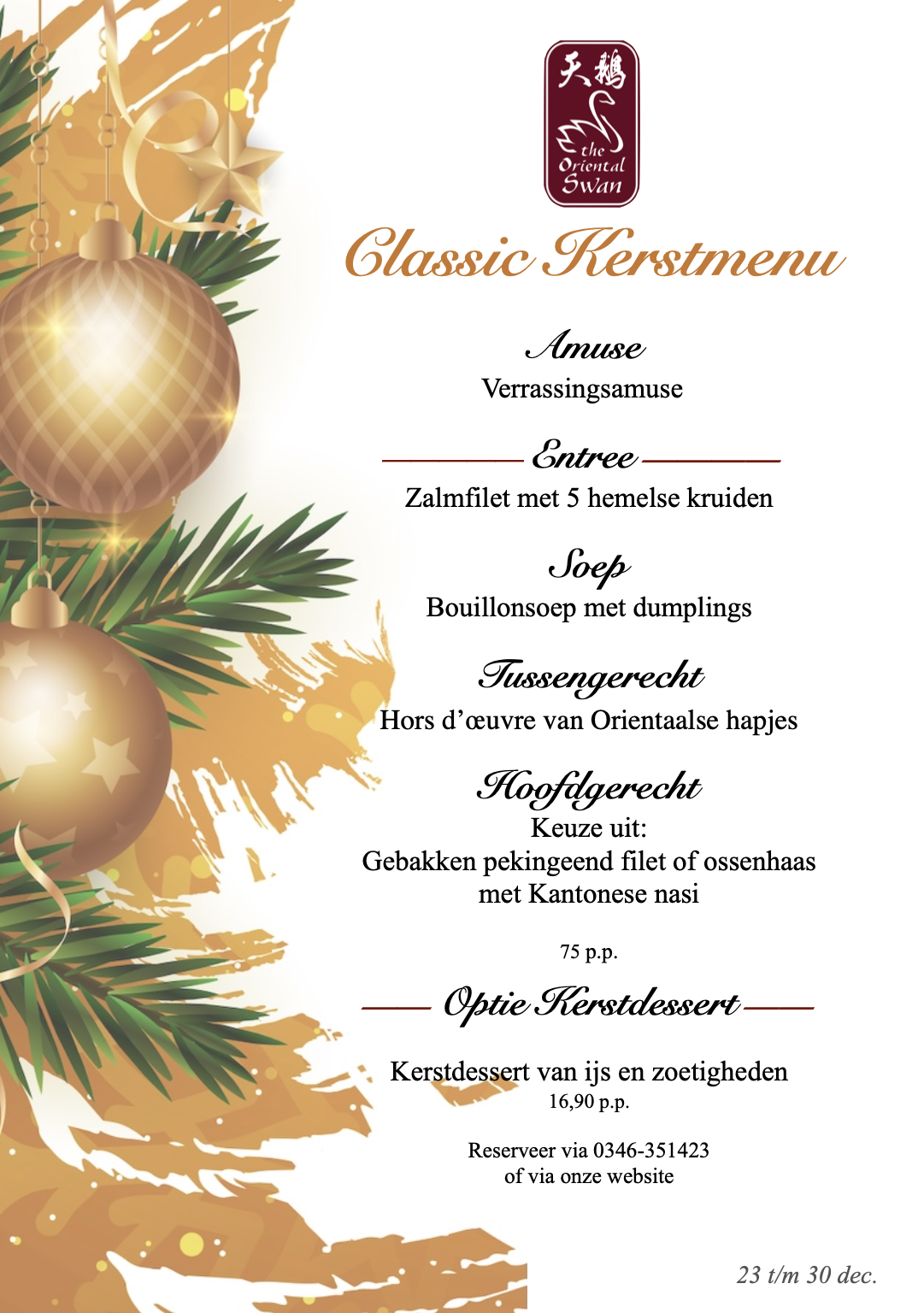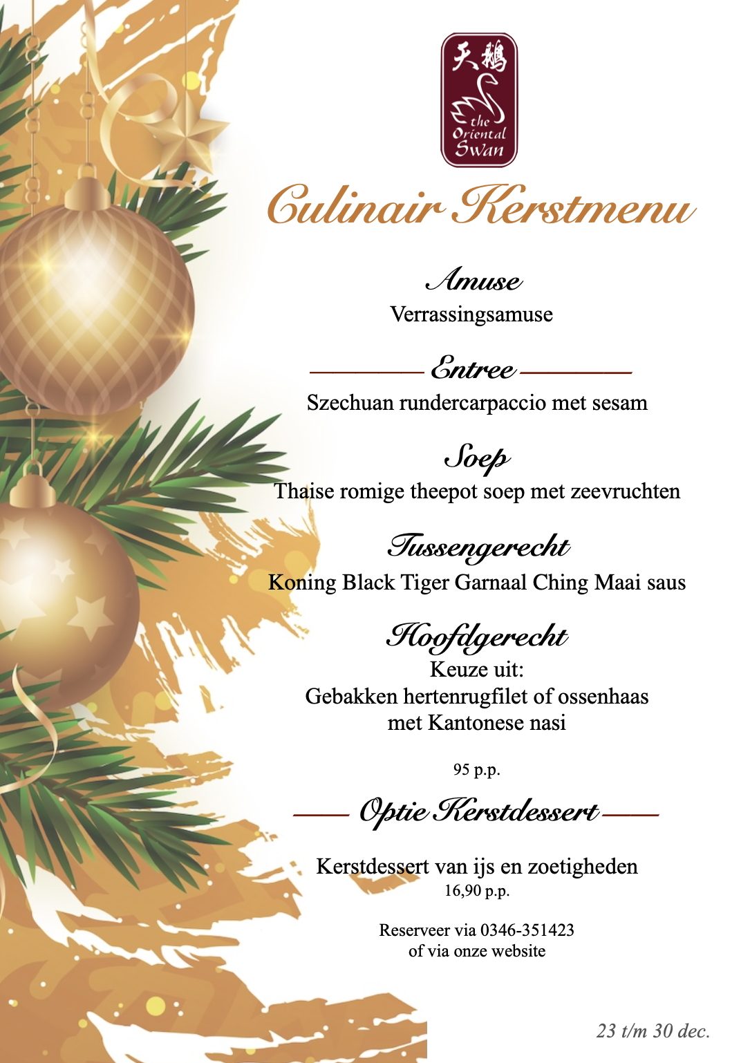Laat je tijdens de kerstdagen smakelijk verwennen door The Oriental Swan! Wij hebben tijdens deze feestdagen een heerlijk Culinair- of Classic Kerstmenu om uit te kiezen.